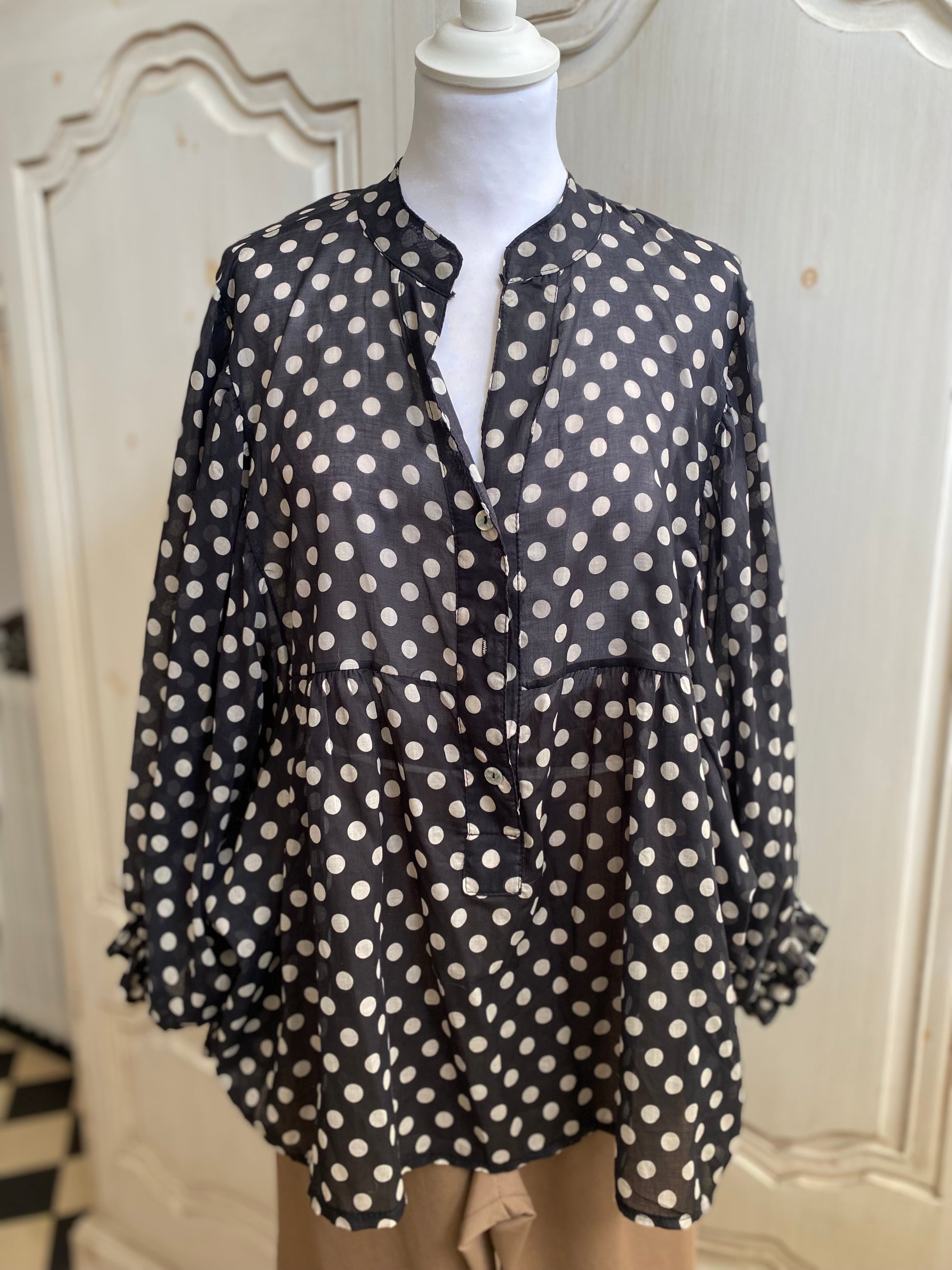 Très jolie blouse en mousseline de coton à pois, col Mao en V Boutonnée sur l’avant manches ballon avec finition ondulée sur les poignets,