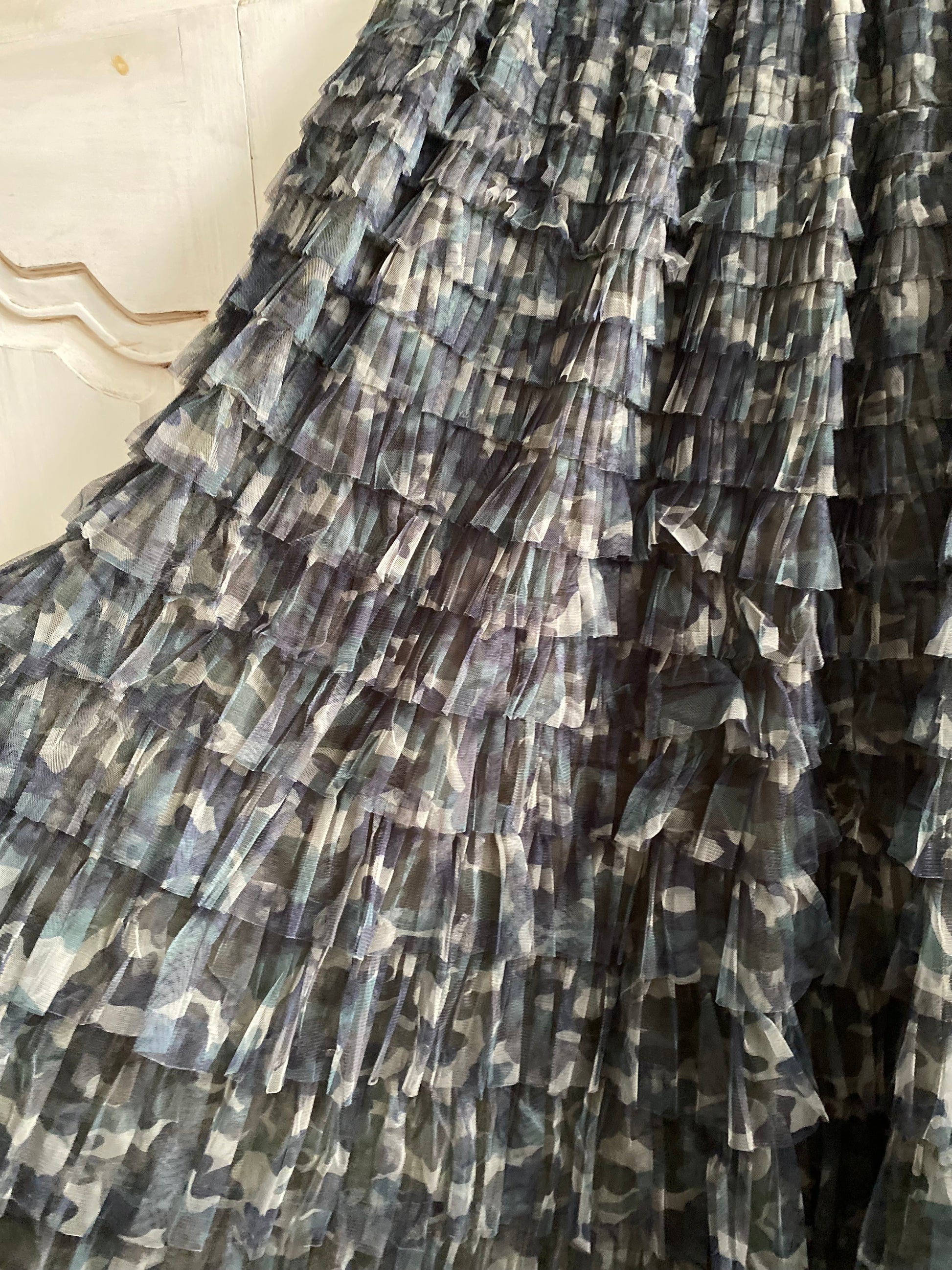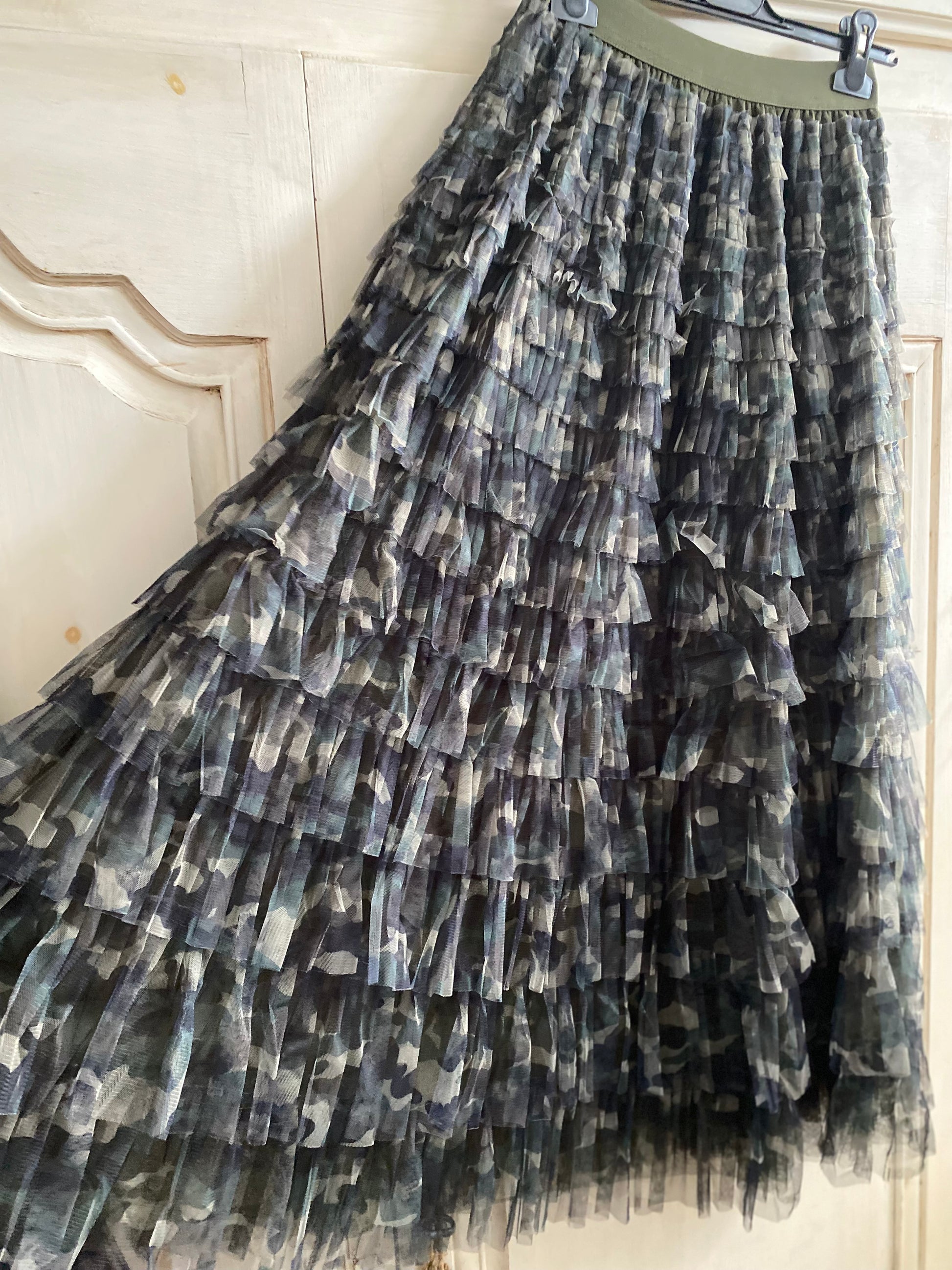 Très jolie jupe en tulle, volant multiples sur toute la hauteur en dégradé de largeur au niveau des hanches et du bas doubler taille élastique hauteur 95 cm, lavage délicat, conseillé