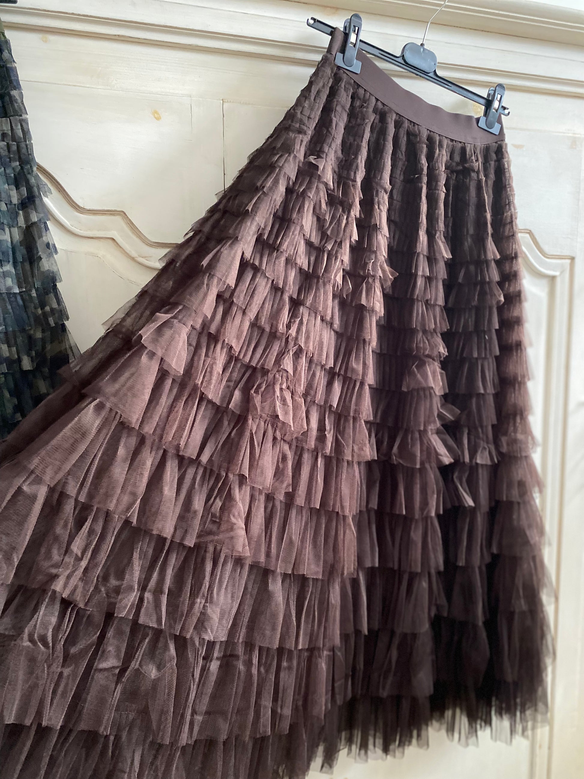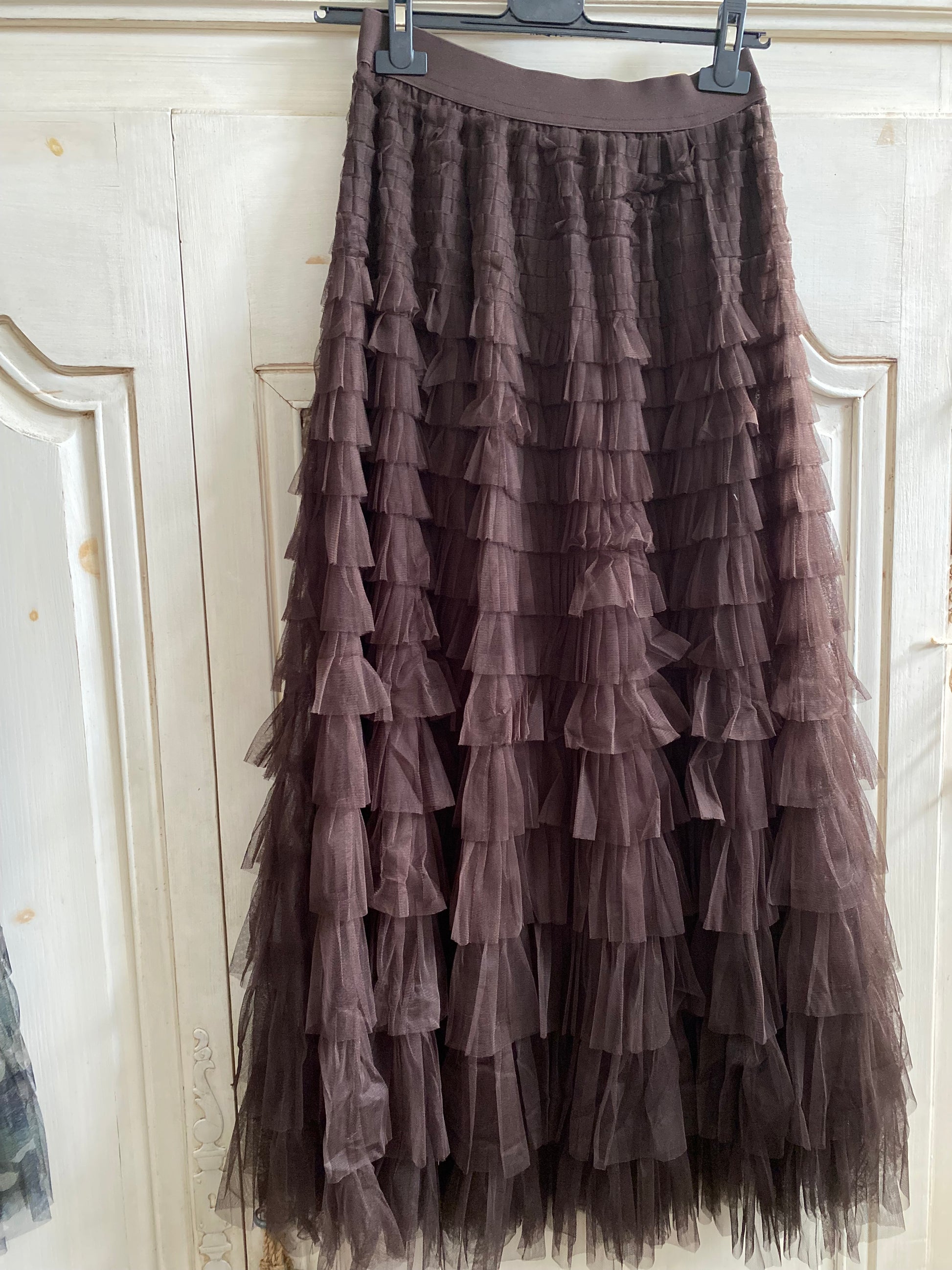 Très jolie jupe en tulle, volant multiples sur toute la hauteur en dégradé de largeur au niveau des hanches et du bas doubler taille élastique hauteur 95 cm, lavage délicat, conseillé