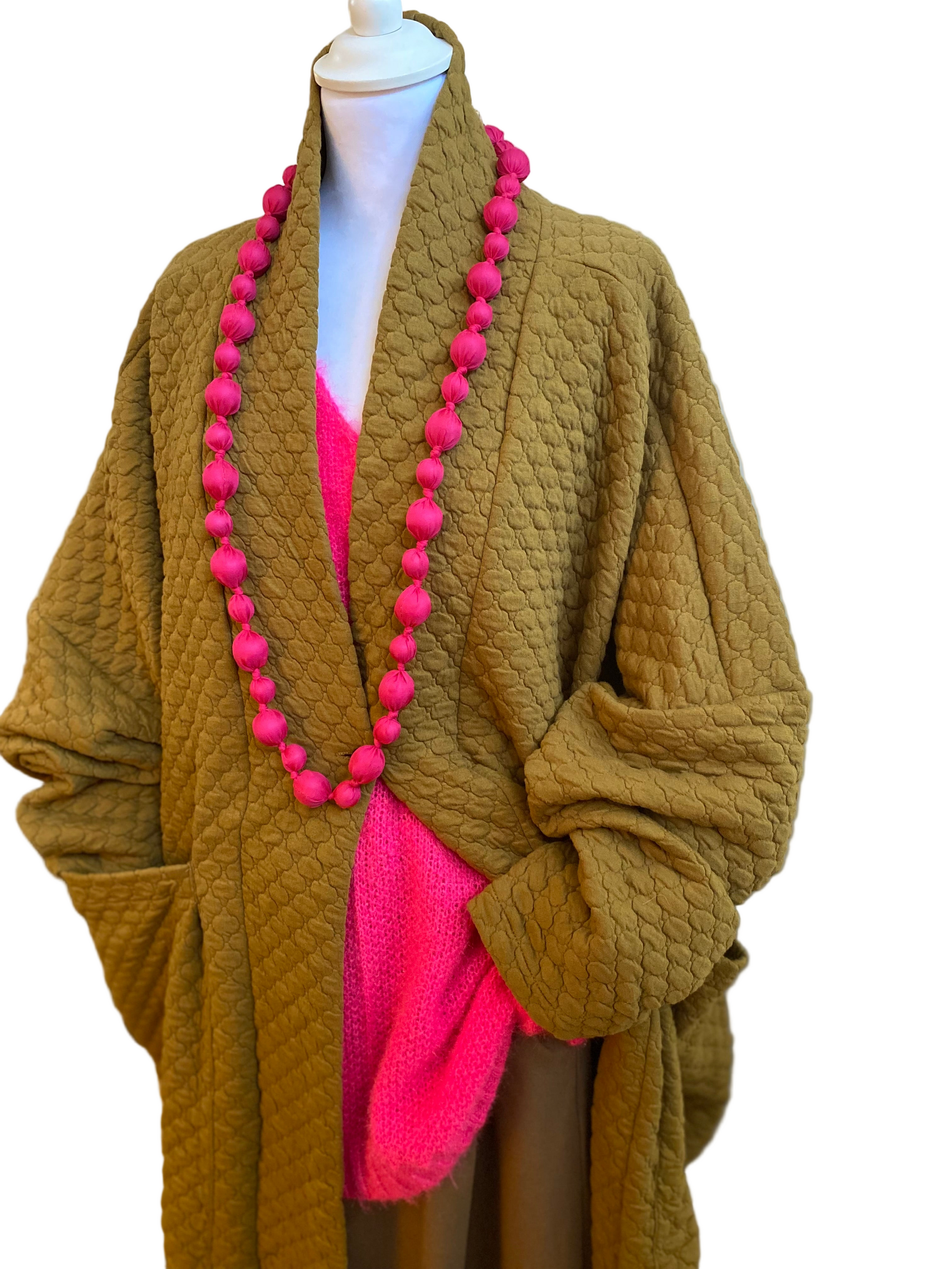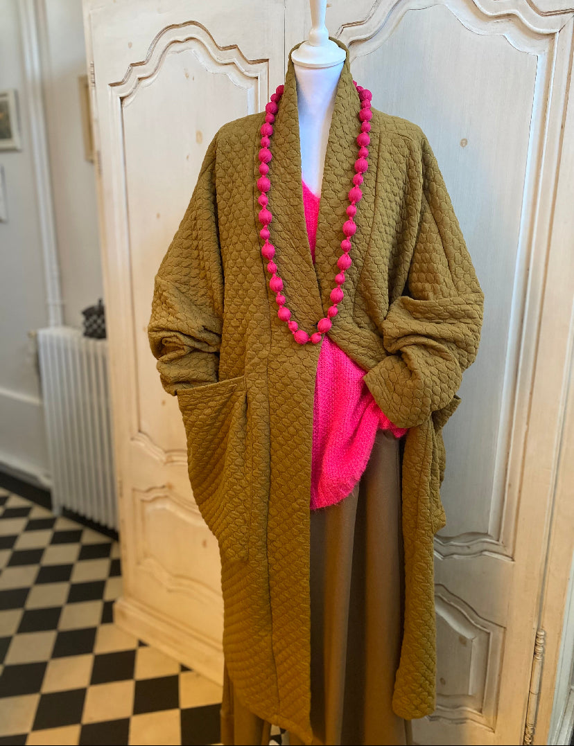 Couper dans un tissu couleur, safran molletonné, une coupe déstructurée fendu sur les côtés deux grandes poches, plaquées fermeture par bouton col large droit, une coupe oversize manches longues et large.