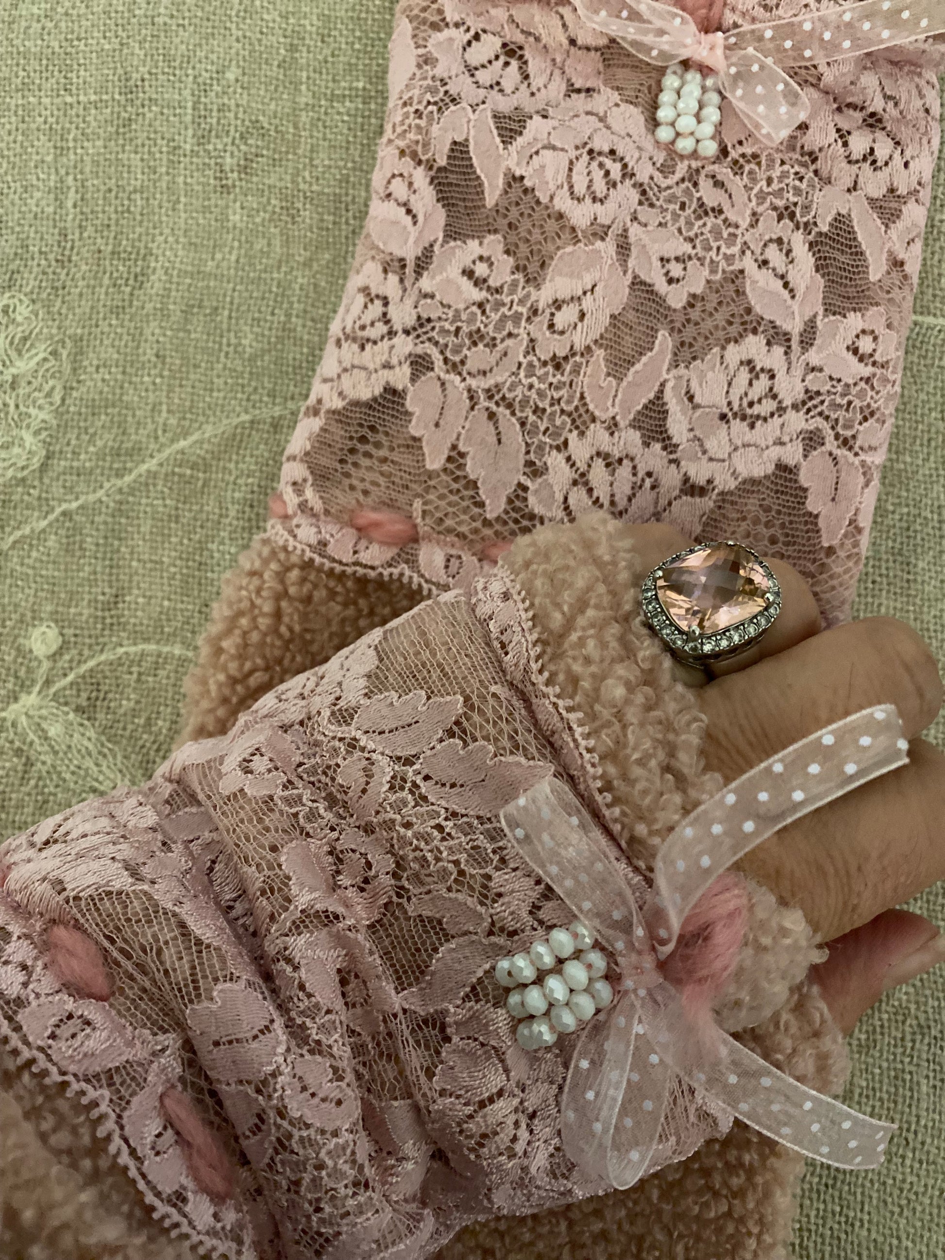 Paire de mitaine longue en lainage boucle ornée de dentelle et de cristaux scintillants T.U