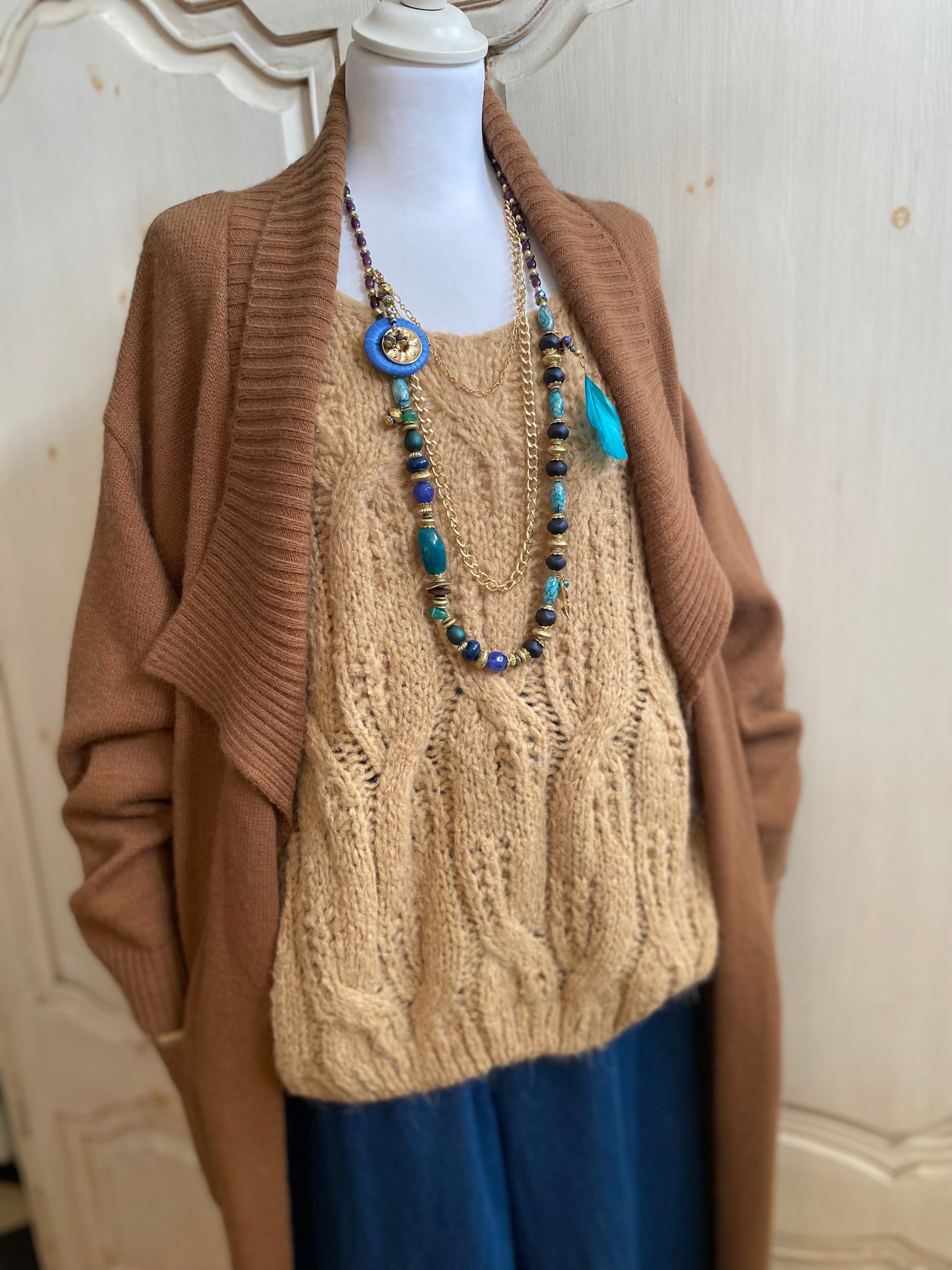 -1 Pull coupe large oversize col en V manches longues, modèle torsade, couleur café, mélange molaire laine et acrylique très doux au toucher.