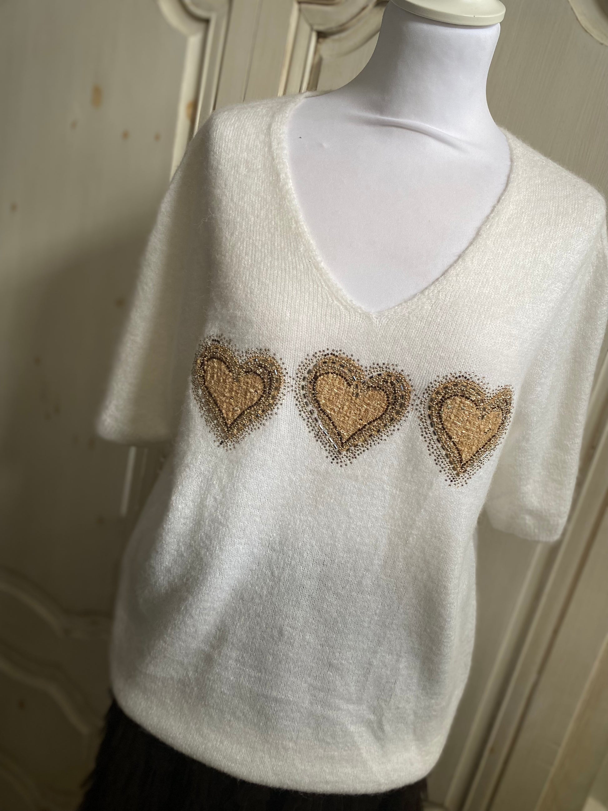 Très jolie petit pull aux trois cœurs, brodés scintillant sur poitrine, col en V. Coupe oversize petites manches hauteur 68 cm tour de poitrine 120 cm composition 38 % acrylique, 32 % polyamide 30 % suprême d’alpaga lavage à la main à froid