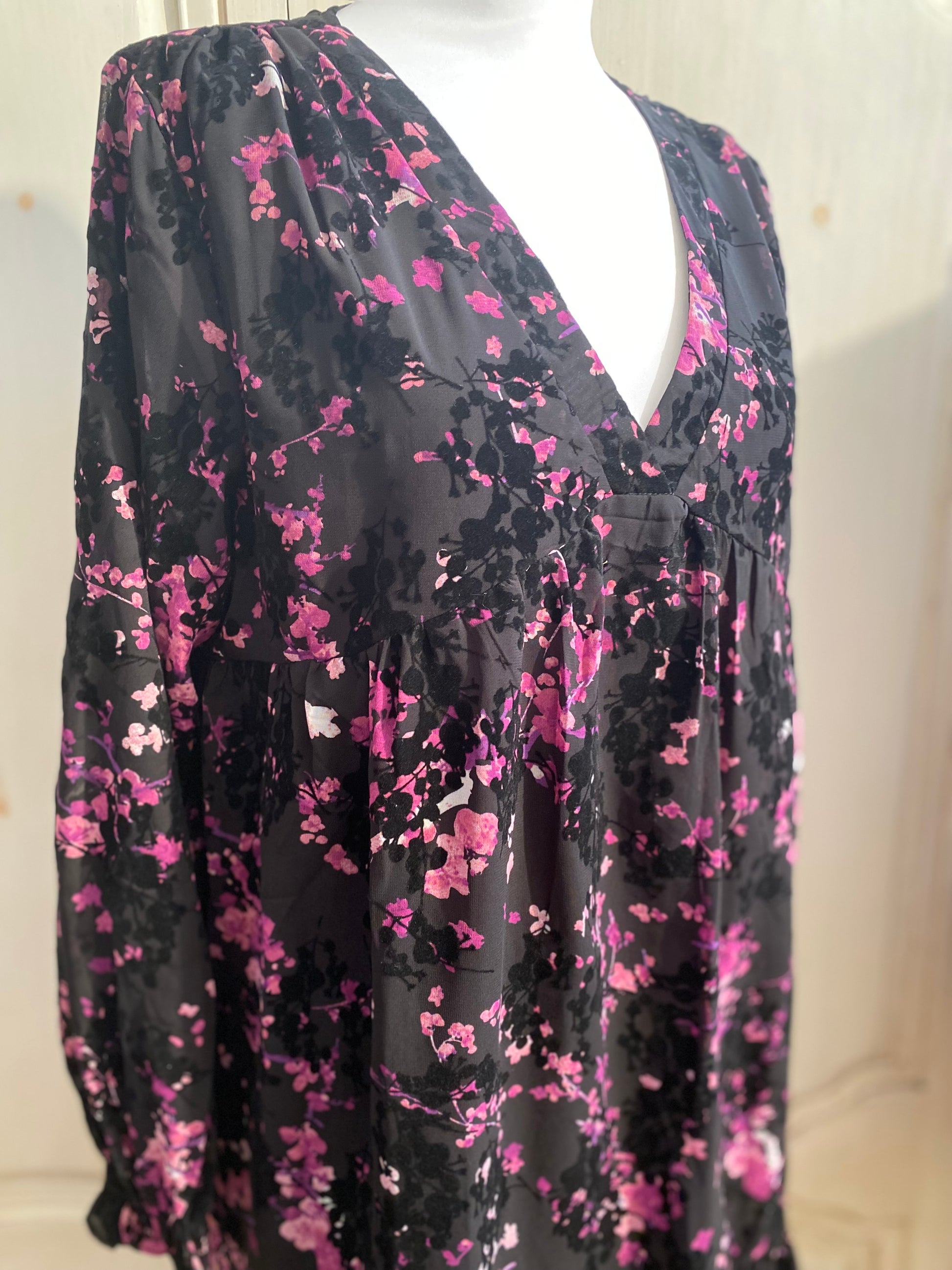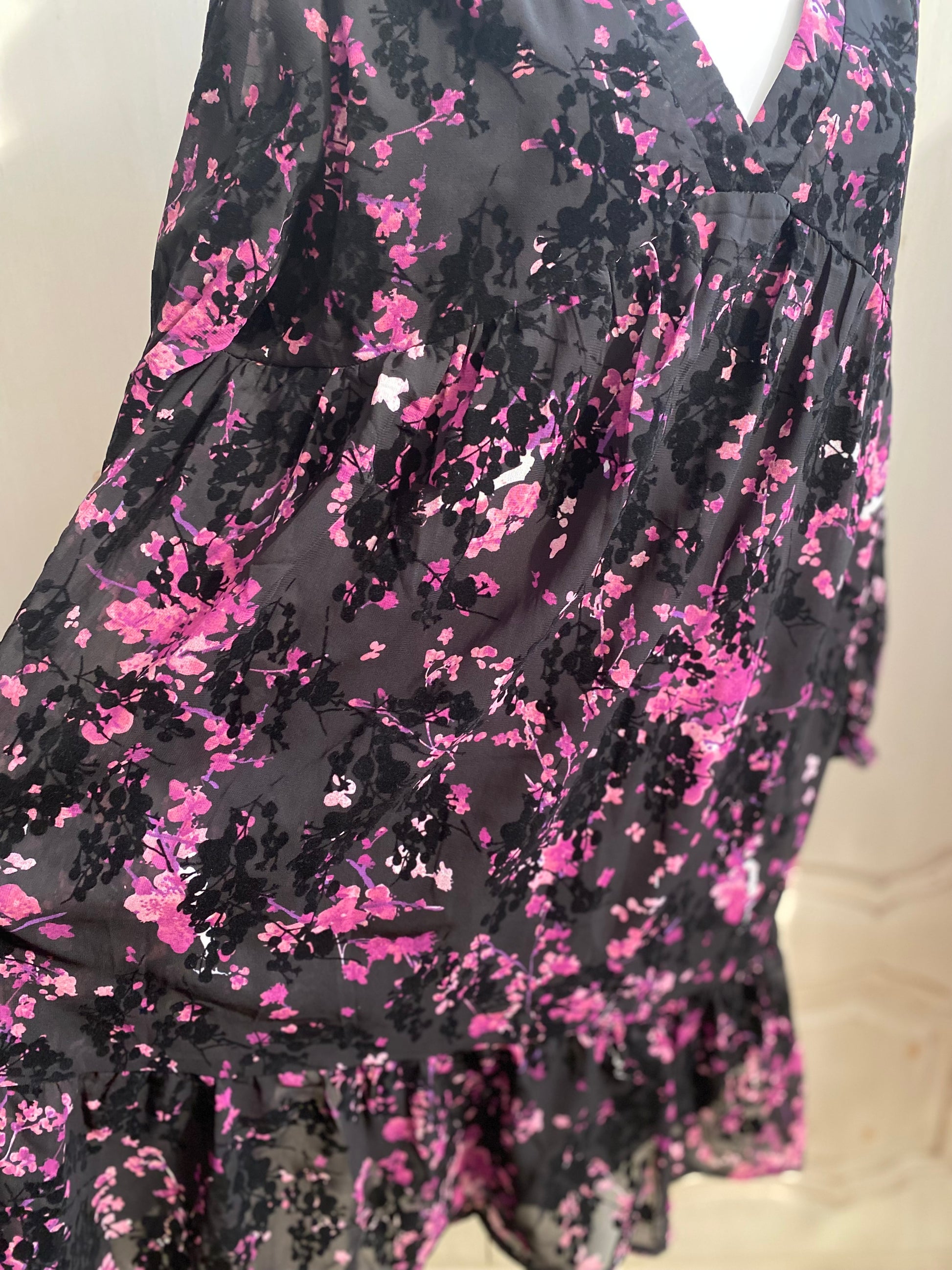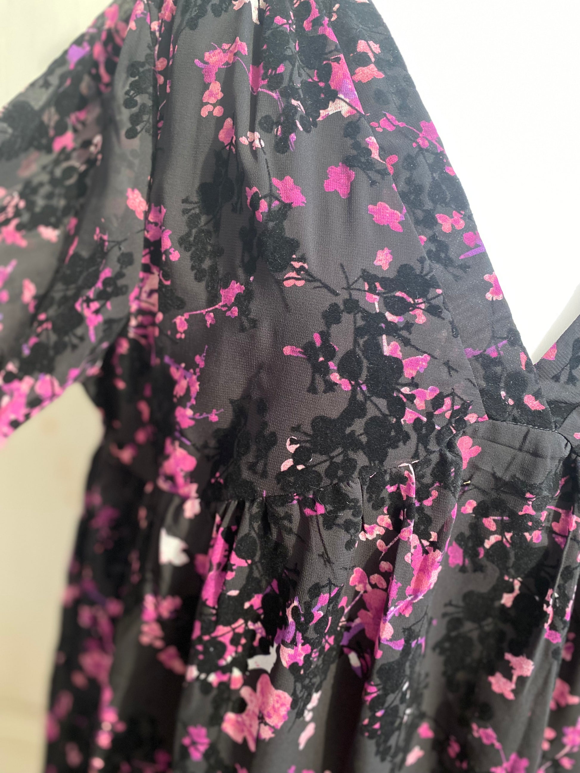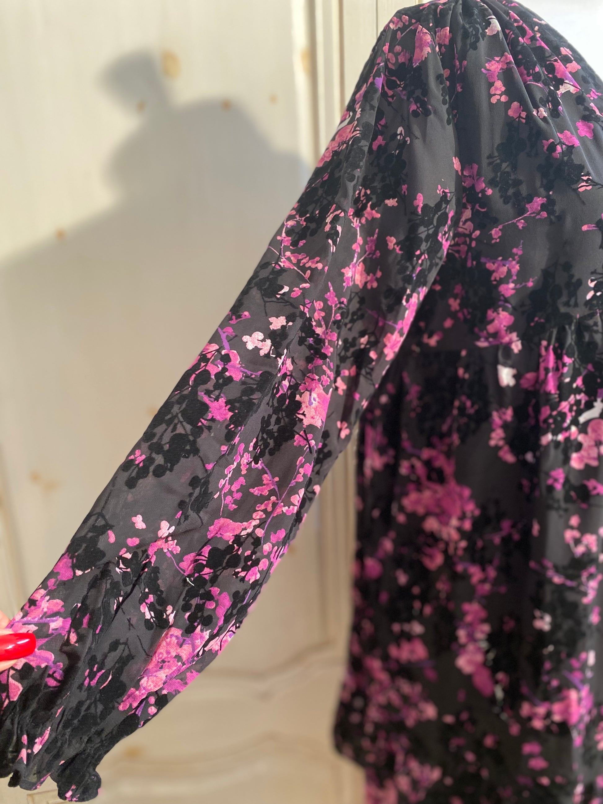 Très jolie robe ultra féminine, en viscose effet velours dévoré, col en V sur l’avant manches longues avec élastique au poignet, coupe trapèze volant large dans le bas doublée en partie central et sur la poitrine manche transparente, hauteur 90 cm tour de poitrine 112