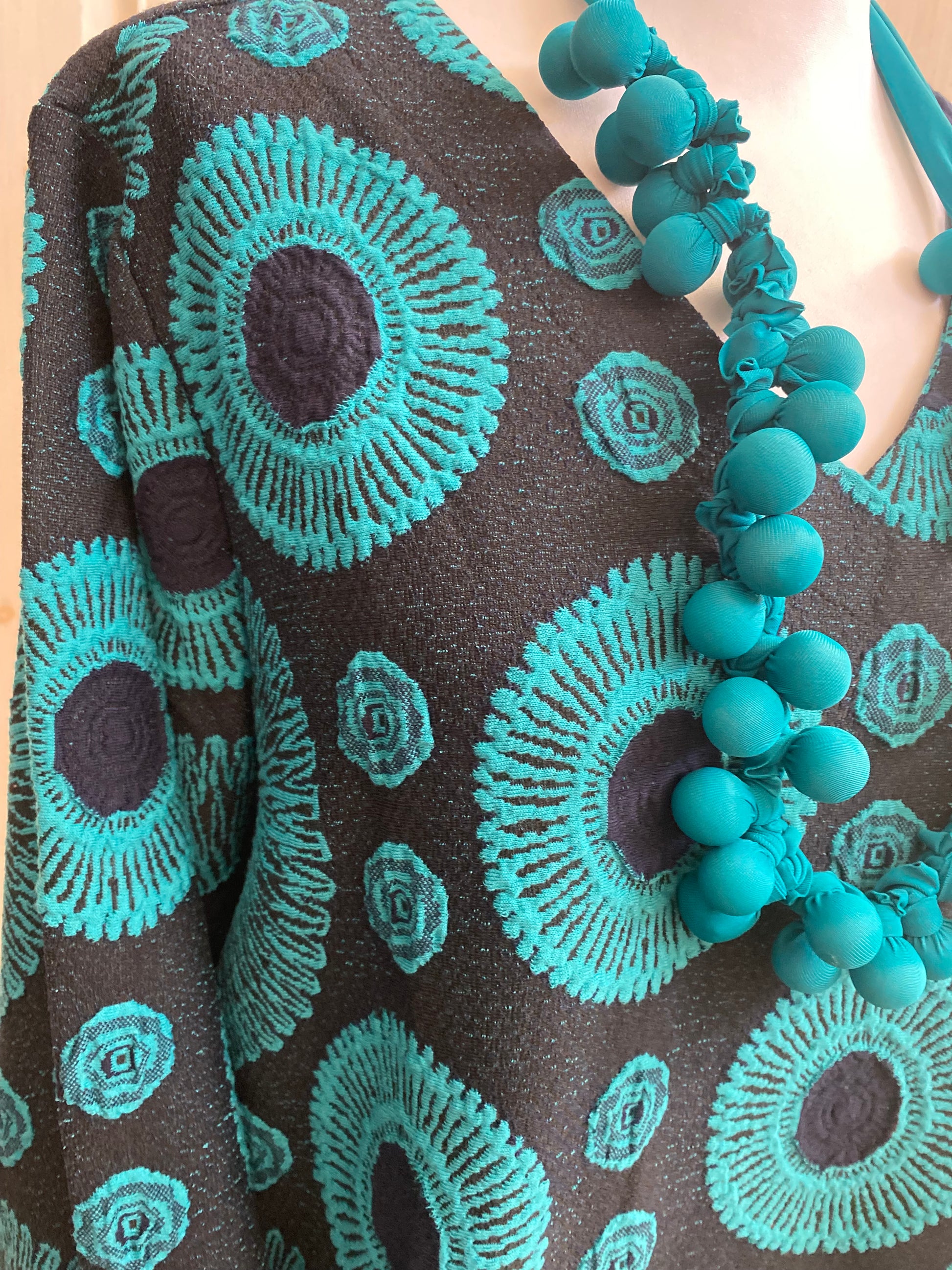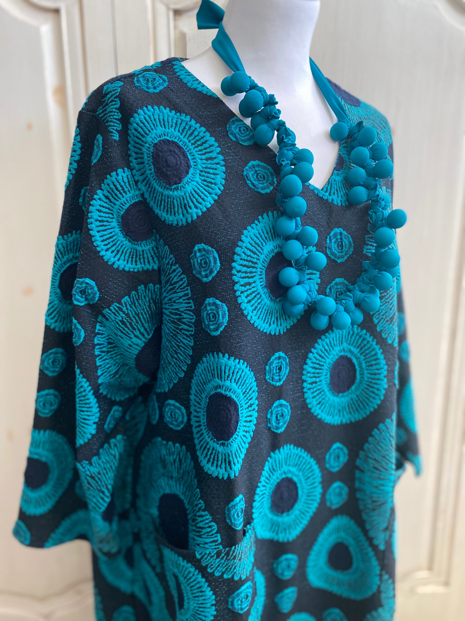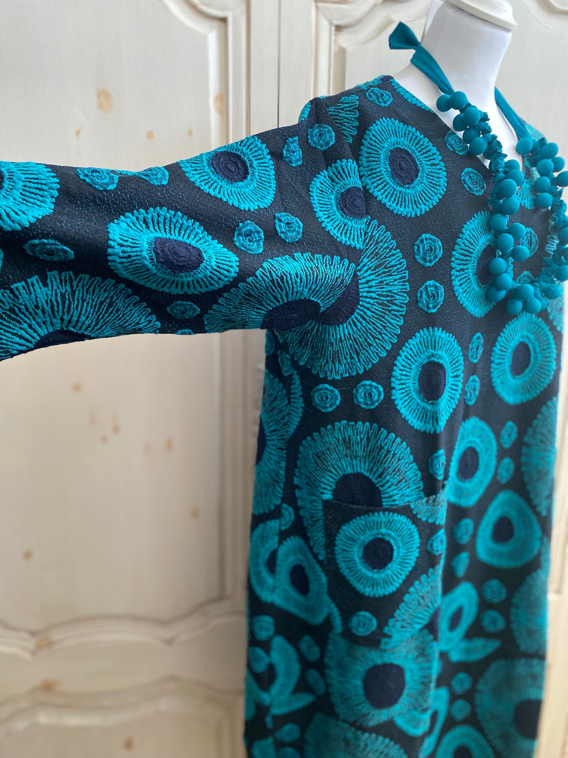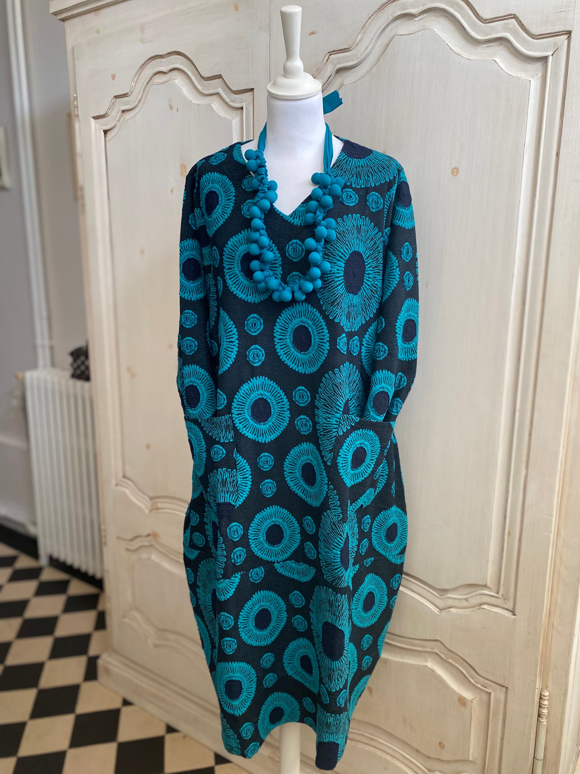 Très jolie robe réalisée dans un tissu légèrement gaufré, 3D,poches plaquées sur l’avant coupe légèrement déstructuré, col en V. Souligné manches large, longue