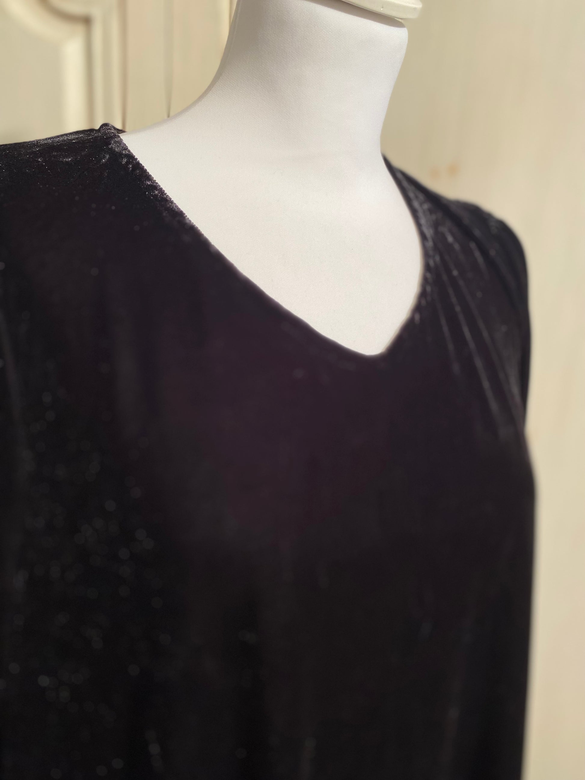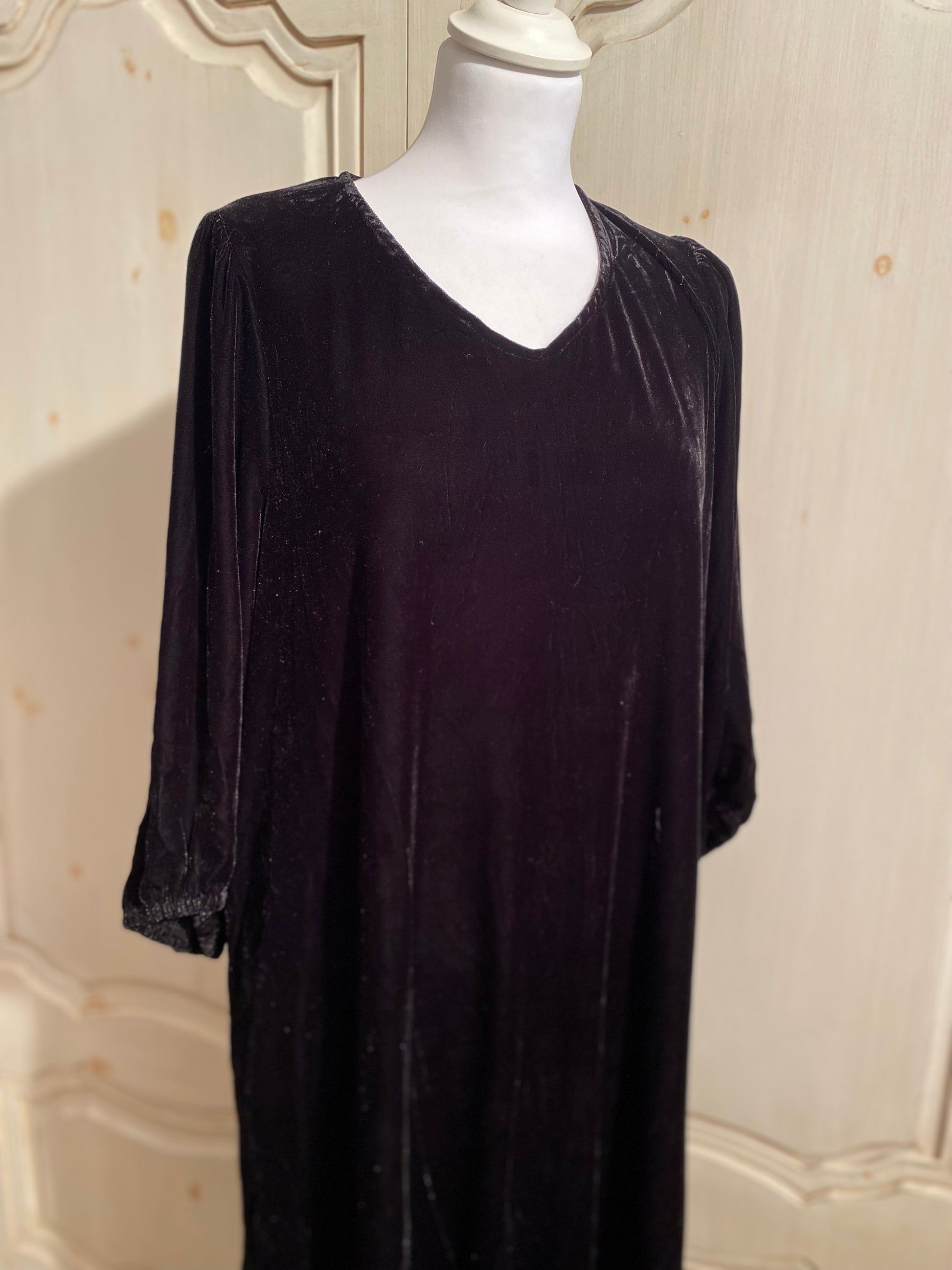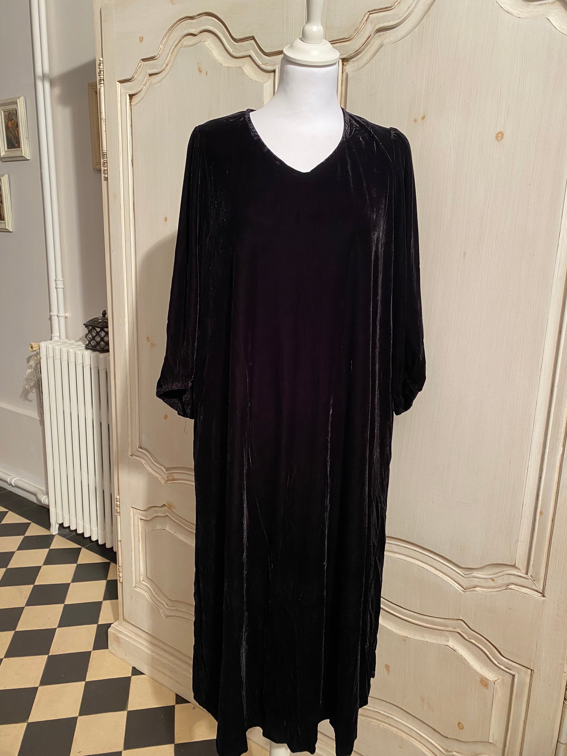 Très belle pièce pour cette robe en velours, noir, façon velours de soie manches trois quarts élastique en bas des manches colle en V. Plissé sur l’Machures coupe over size droite, fendue légèrement dans le bas poche sur les côtés.