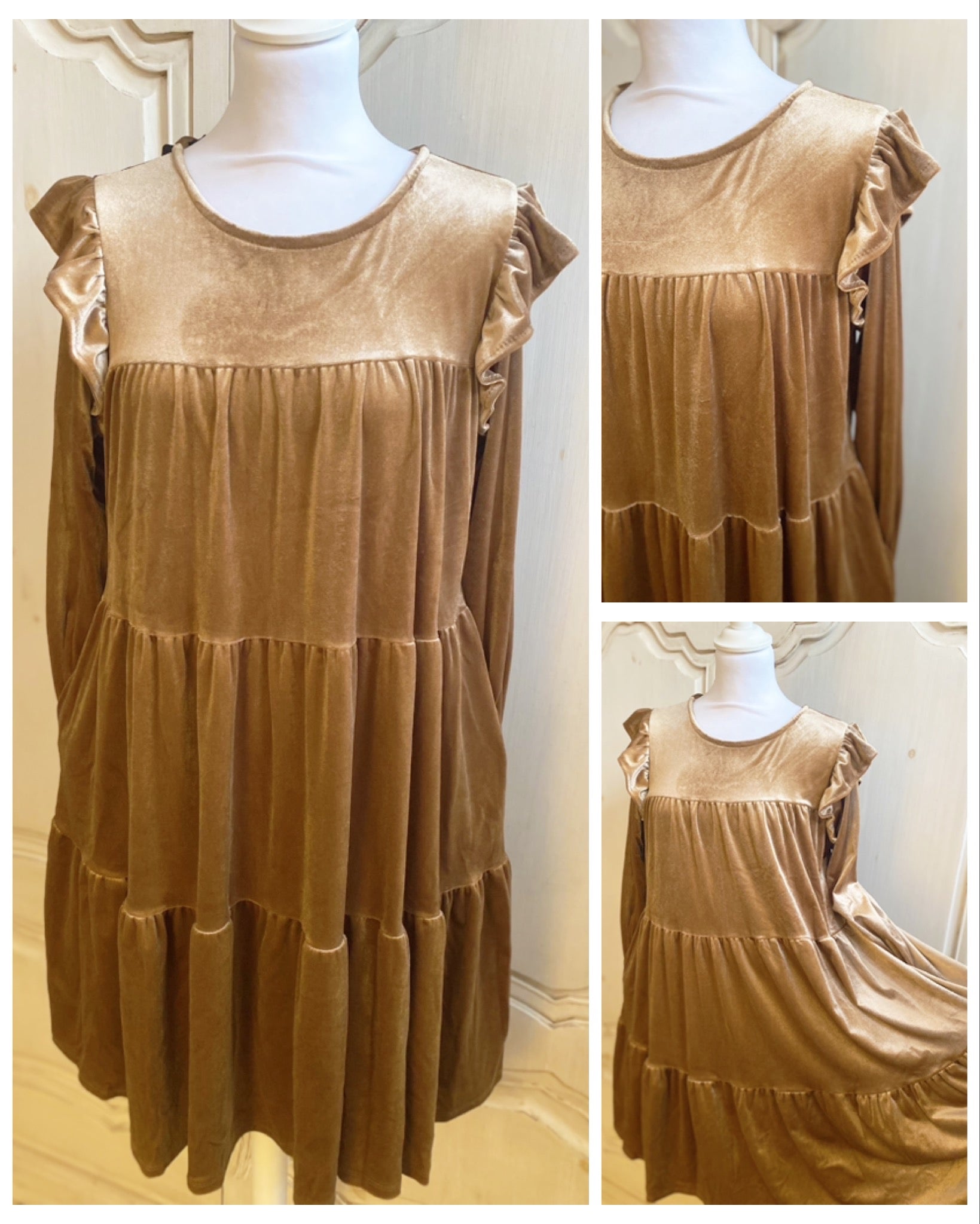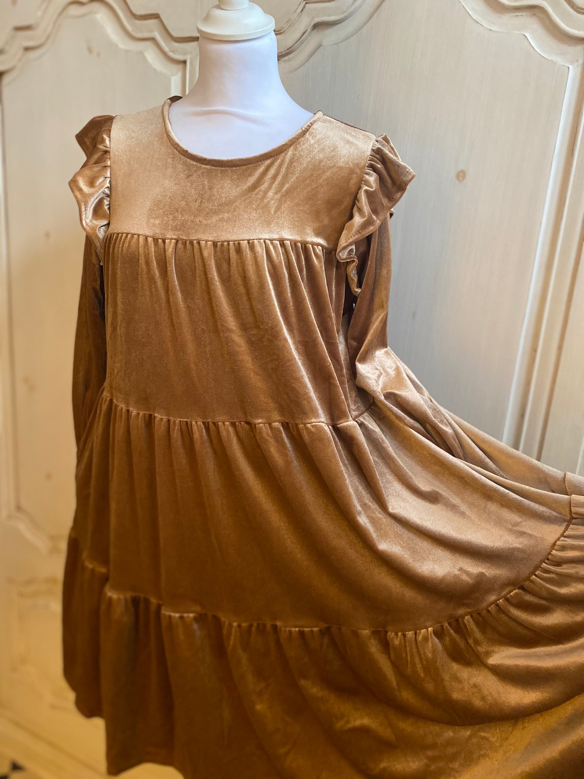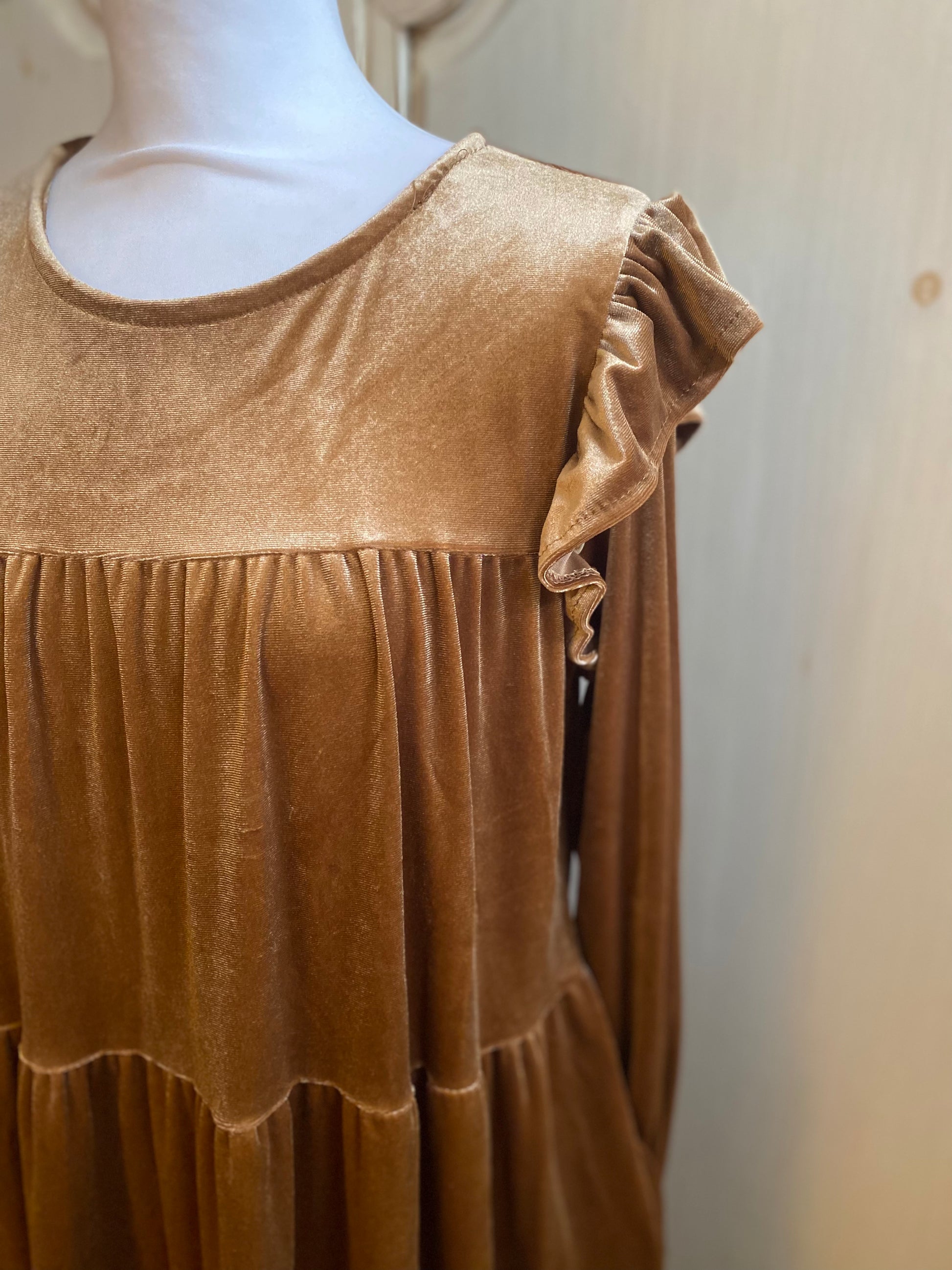 Jolie robe dans un tissu façon velours de soie infroissable coupe double trapèze Oversize col rond manches longues ballons volants sur les épaules