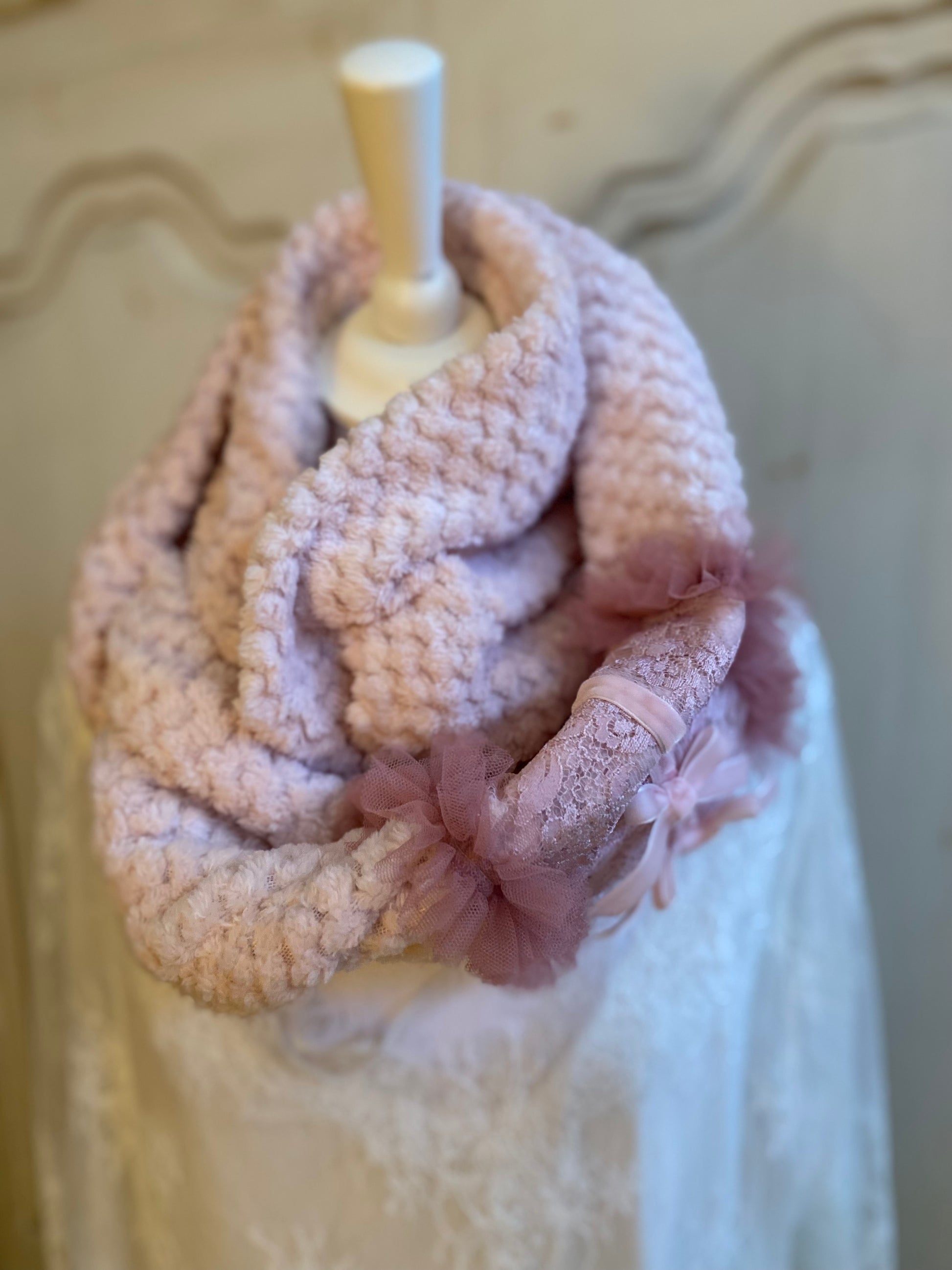 Réalisé dans un tissu, pilou pilou rose poudré deux tours de cou, double face avec gallon en dentelle et gallon de mousseline de Tulle Rose assorti. Lavage à la main, conseillé.