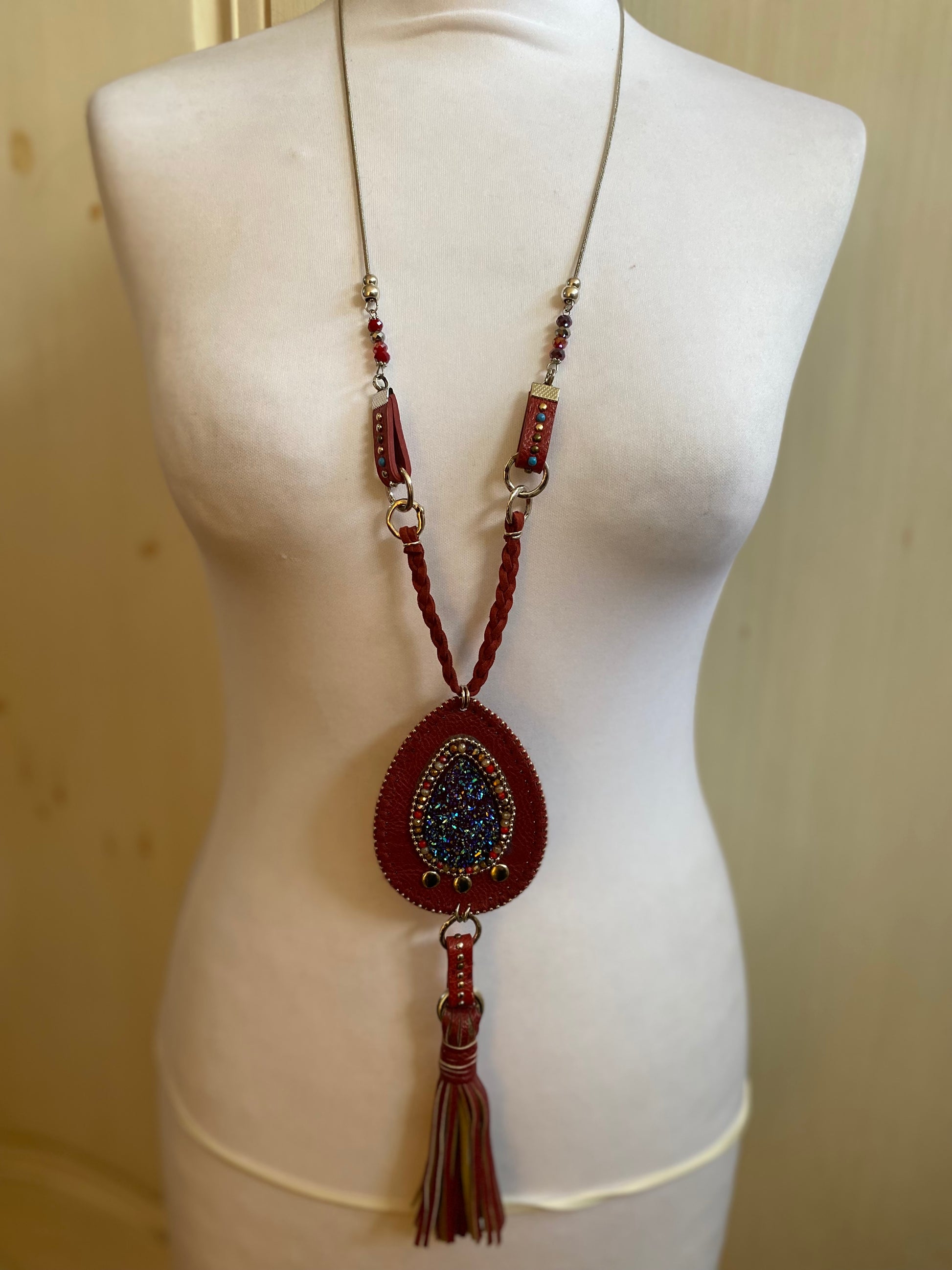 Original dans son style, un joli sautoir monté sur du similicuir bordeaux et Cristaux fixés dans la masse aux reflets bleu au centre comme un cabochon. Le modèle est déstructuré chaînette anti allergique.