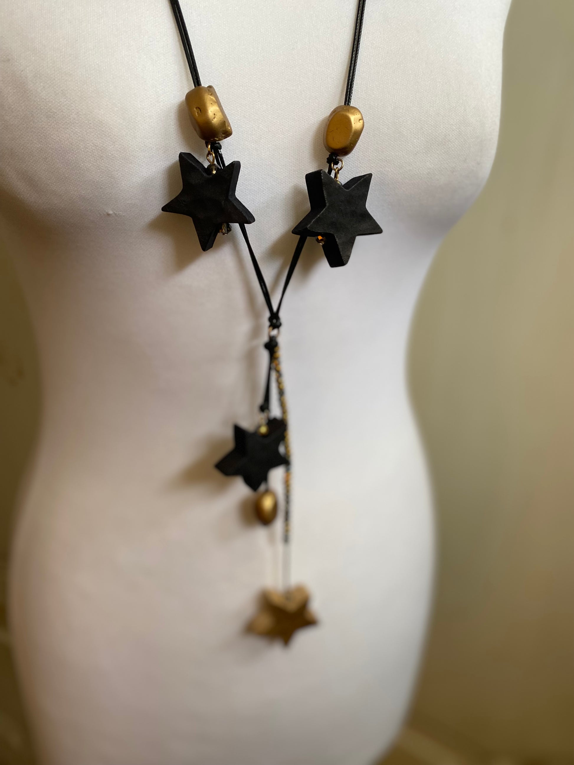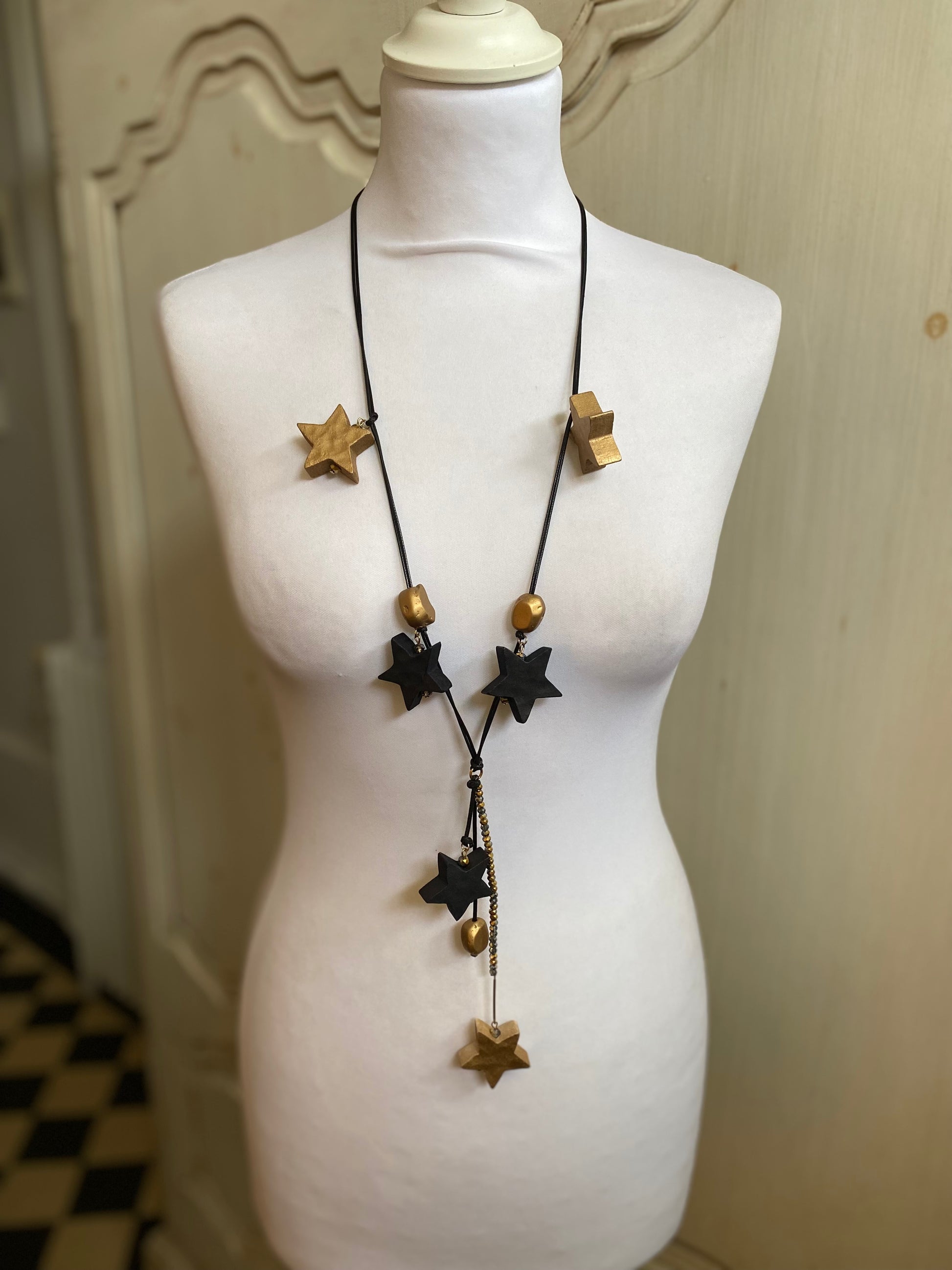 Joli sautoir etoilé doré et noir monte sur cordon coton coulissant Rand de cristal couleur assortie