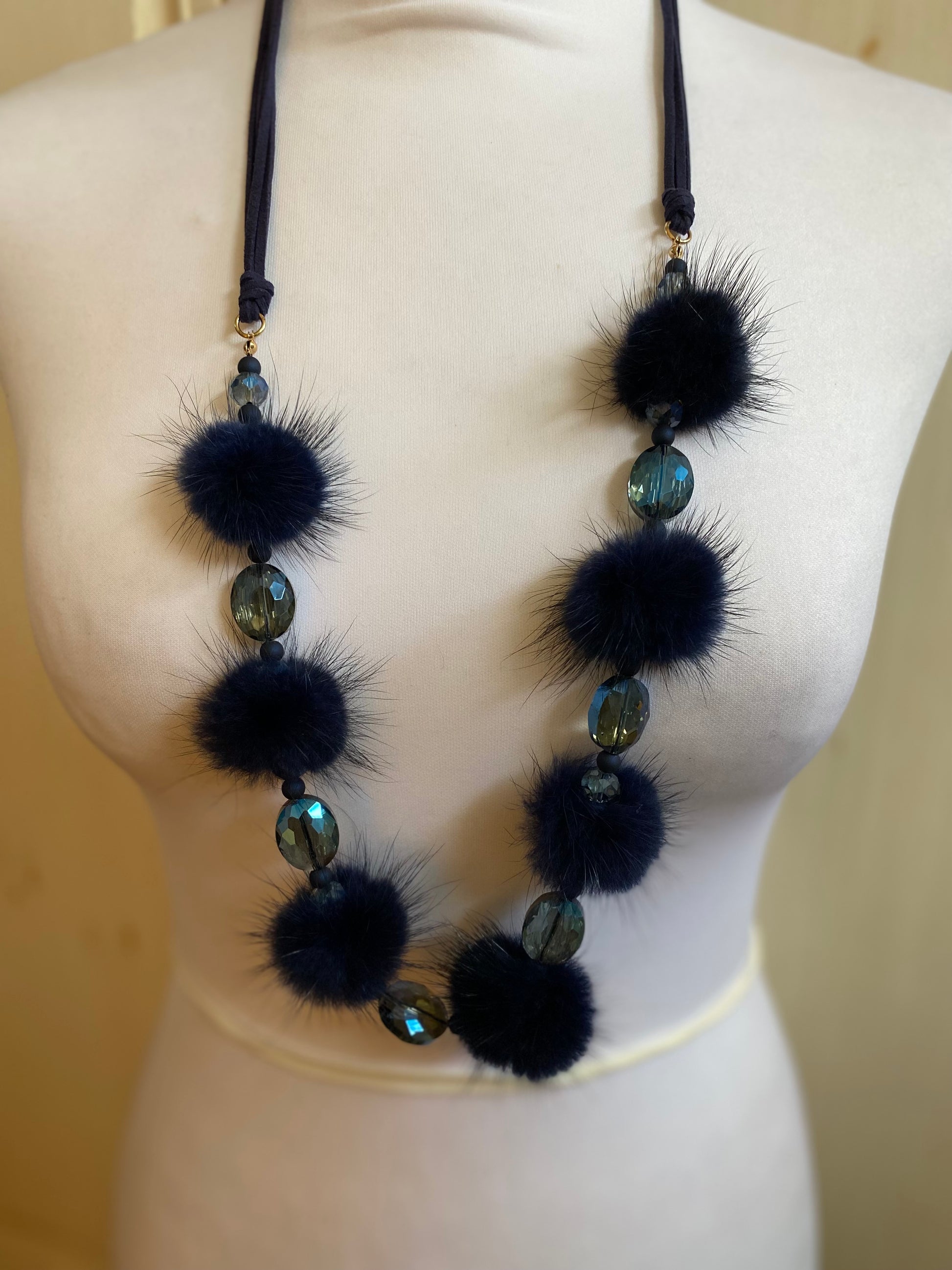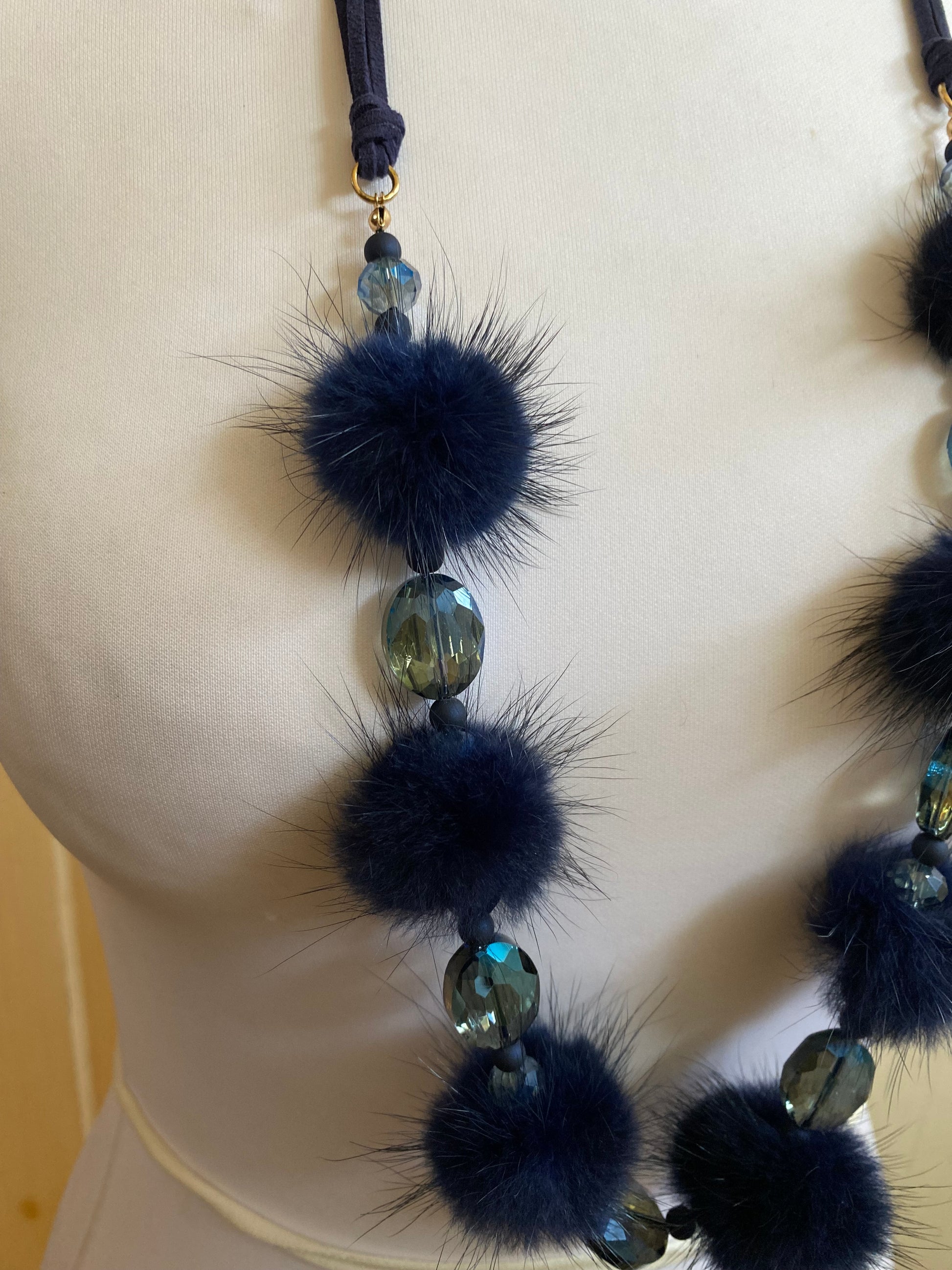 Très joli sautoir avec du cristal facetter couleur assorti au pompon en fausse fourrure, monter sur cordon en simili daim anti allergique.