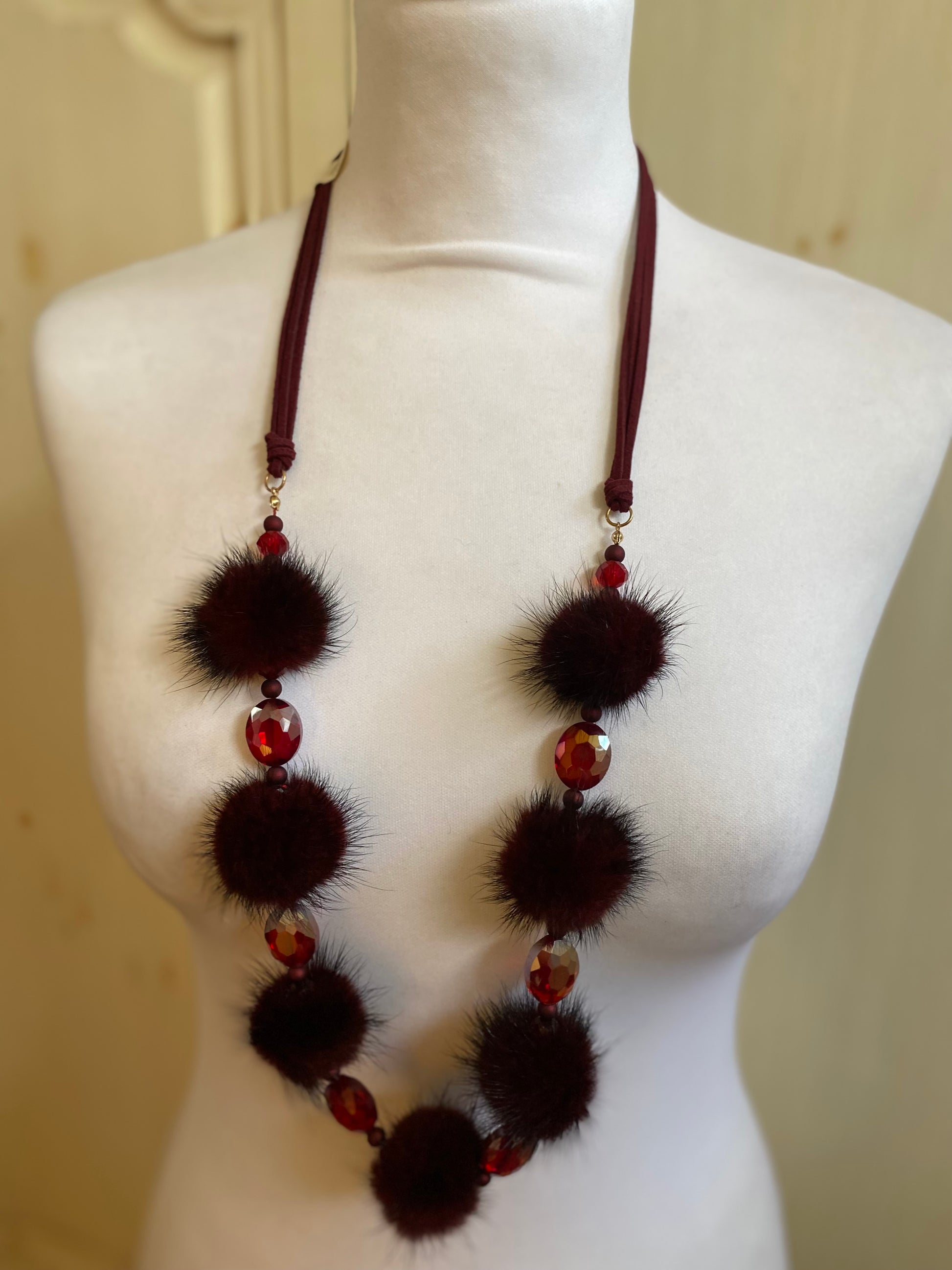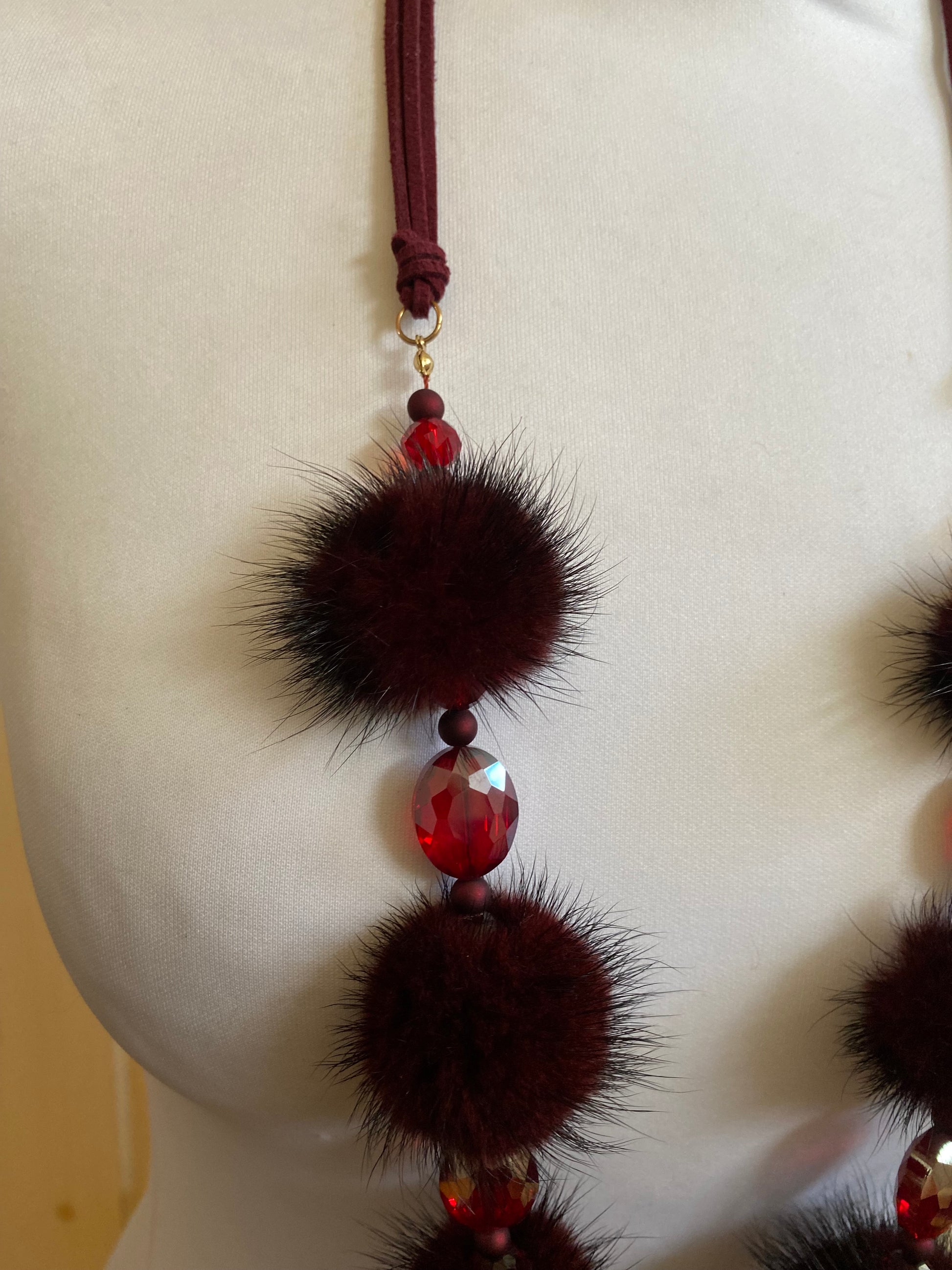 Très joli sautoir avec du cristal facetter couleur assorti au pompon en fausse fourrure, monter sur cordon en simili daim anti allergique.