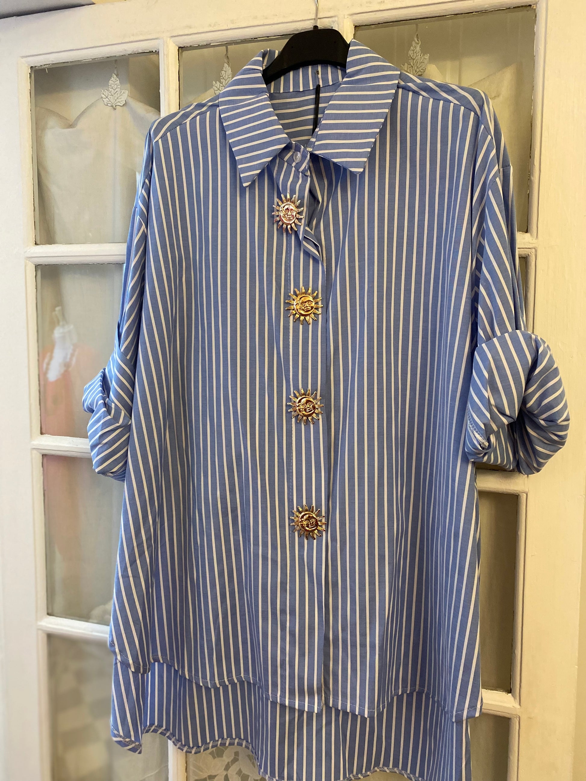 -1 Chemise soleil en 100 % coton, modèle bayadères, boutonné sur l’avant et des soleils en métal doré sur la boutonnière que vous pouvez retirer lors du lavage.