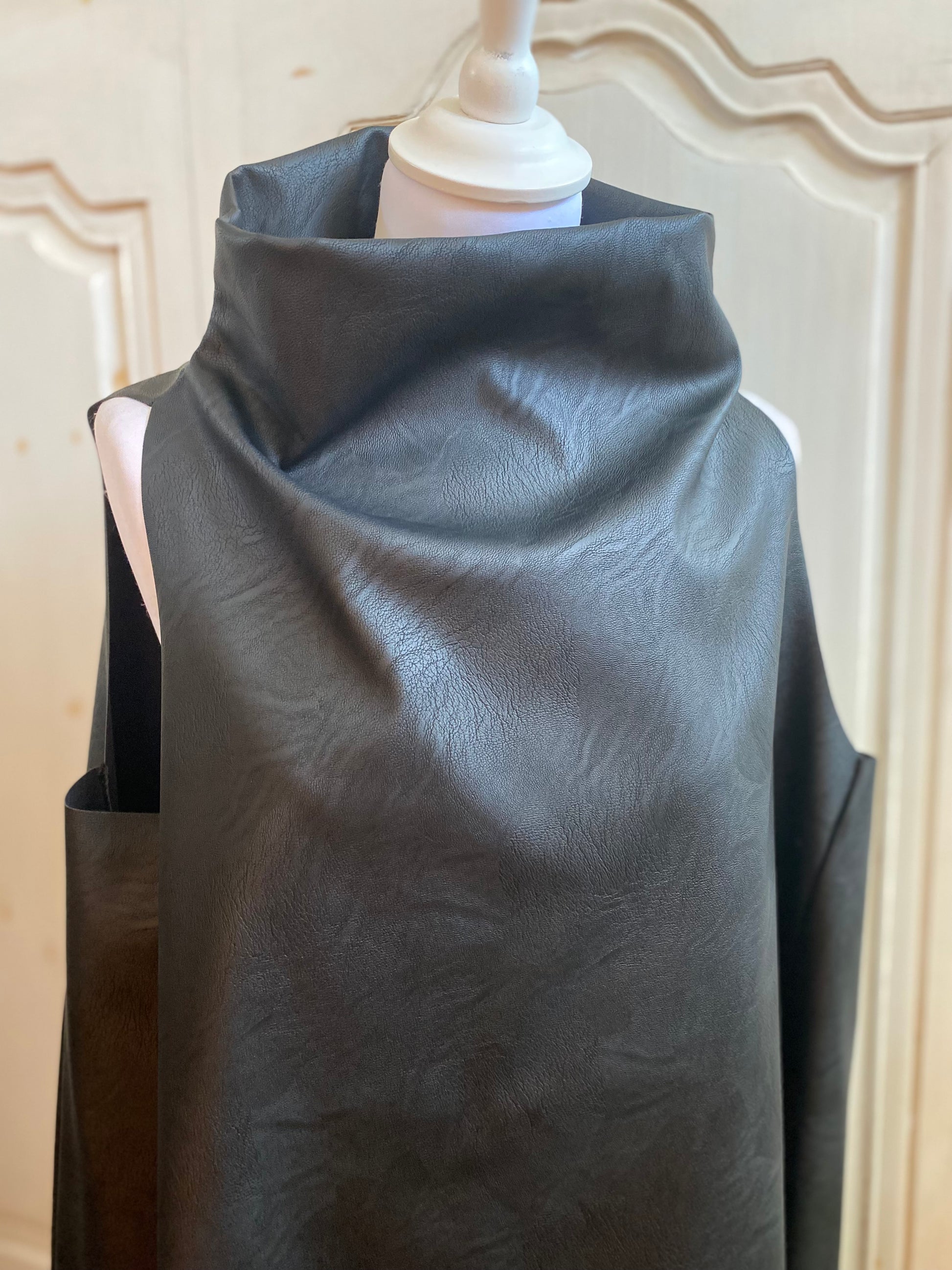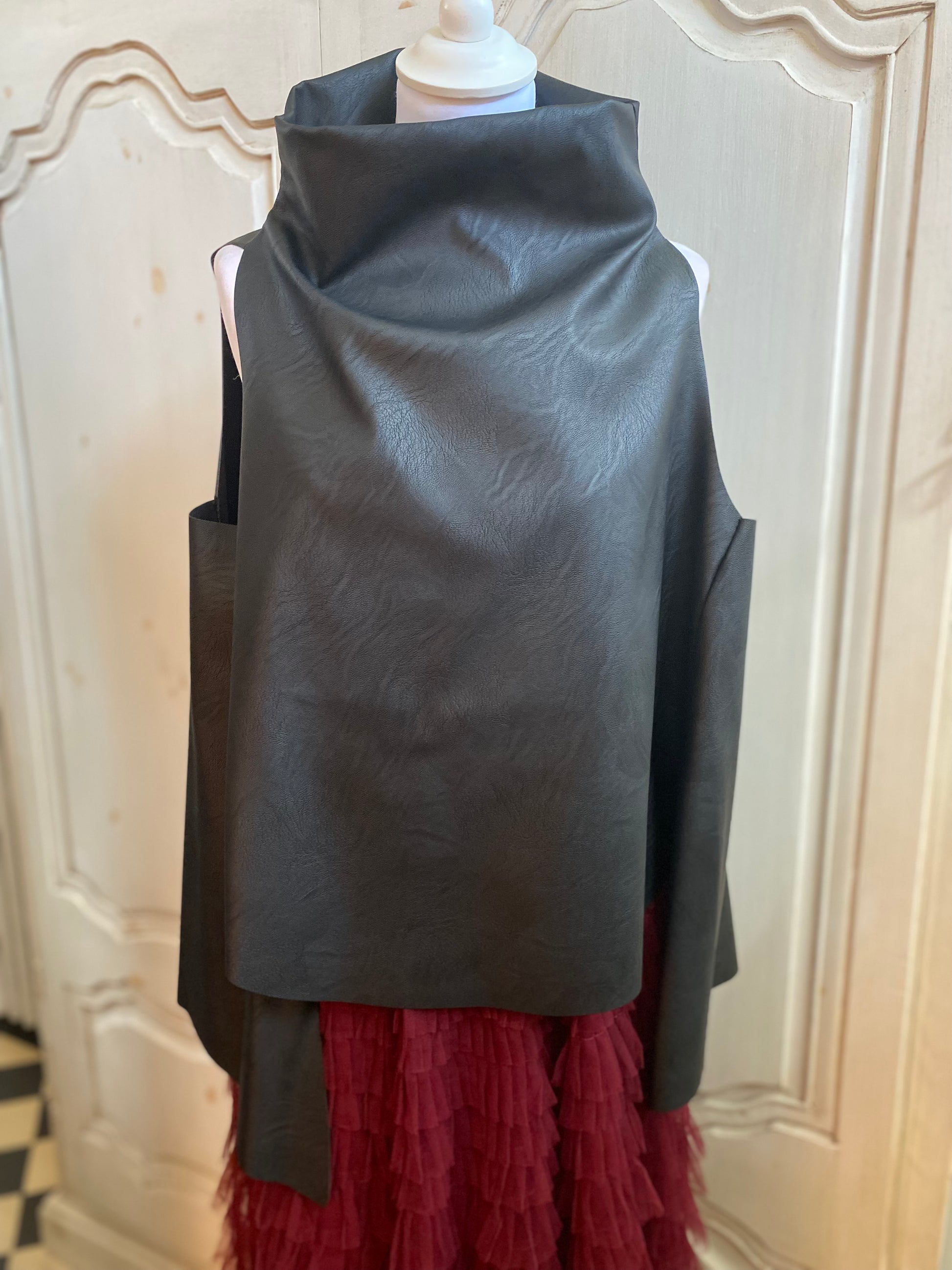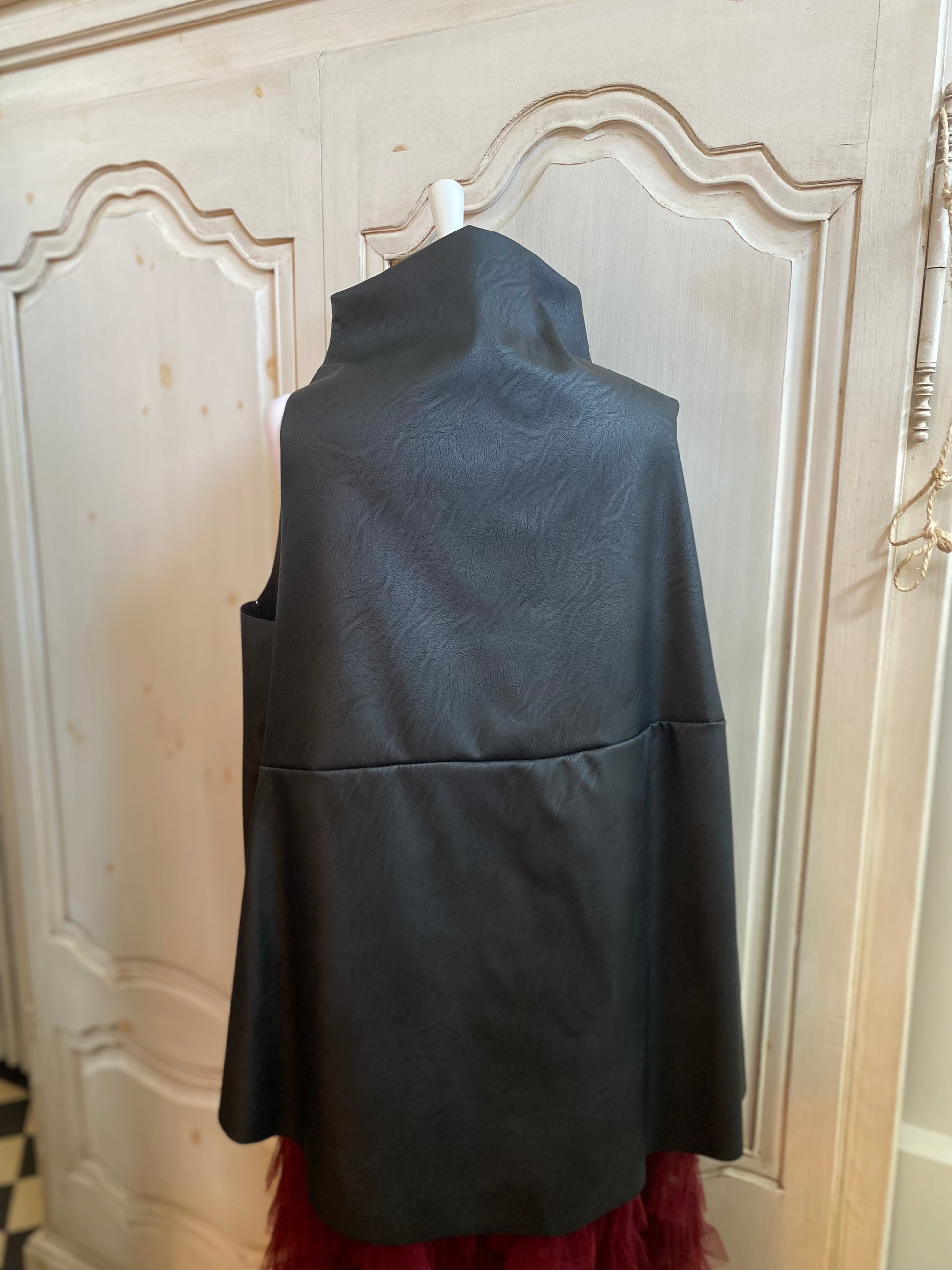 Très jolie tunique, déstructurée en similicuir col montant sans manches déstructuré au niveau de l’arrière et de l’avant tissu similicuir