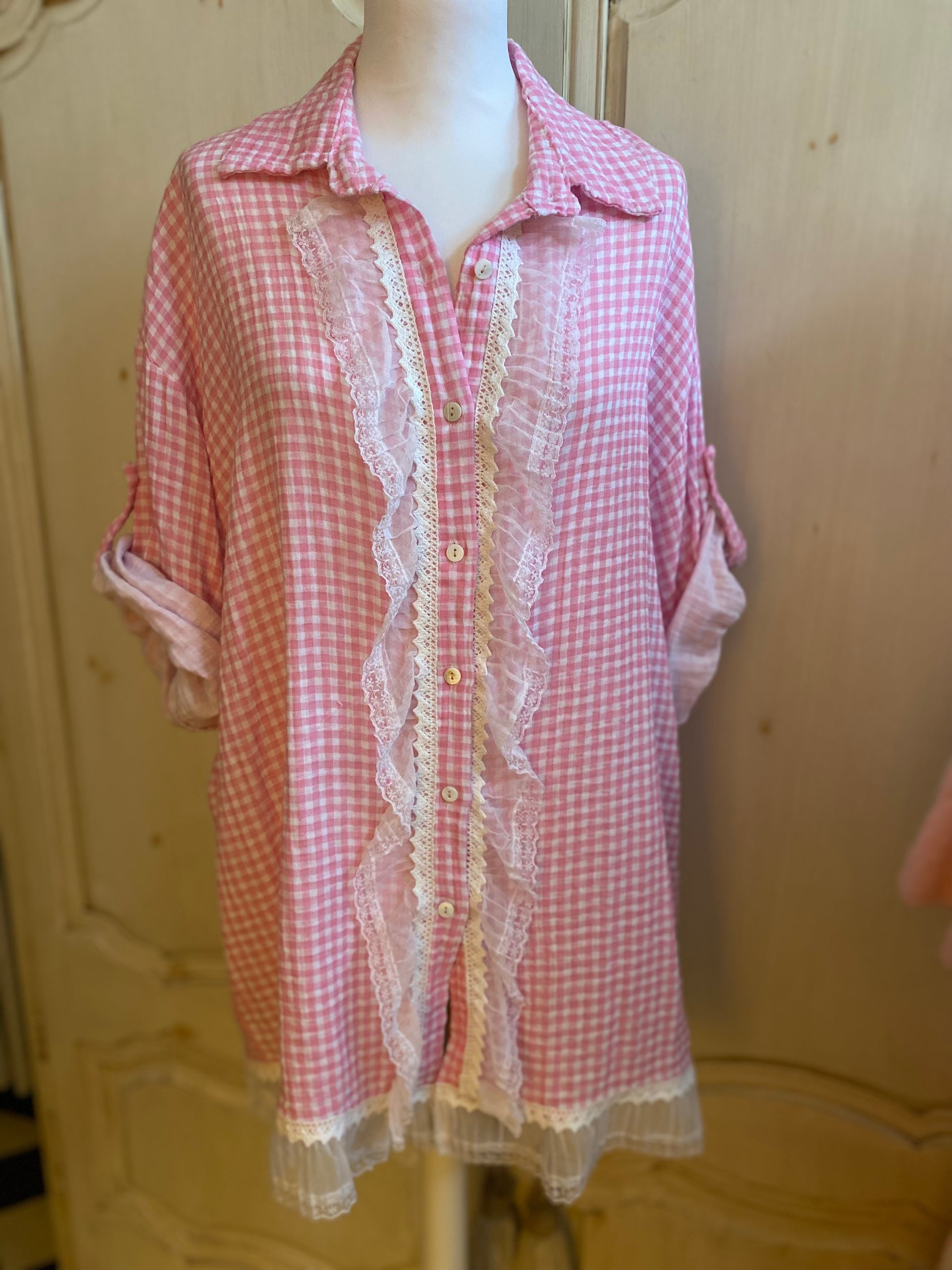 Tunique en vichy rose Double gaze de coton manches 3/4 large col italien coupe oversize 100 % coton dentelle au col et dans le bas de la tunique entièrement boutonnée